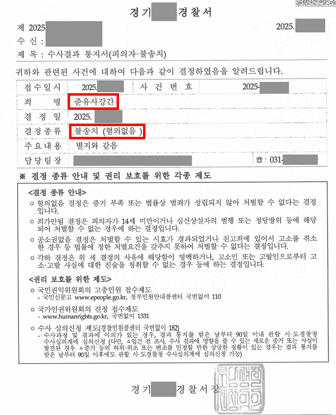 - 경찰에 혐의 없음 의견서를 다수 제출하며, 법적 구조 및 증거 분석을 체계적으로 설명했습니다.