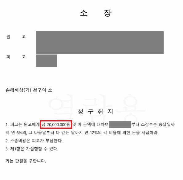 이렇게 원고는 피고에게 총 2천만 원의 손해배상청구를 했습니다.
