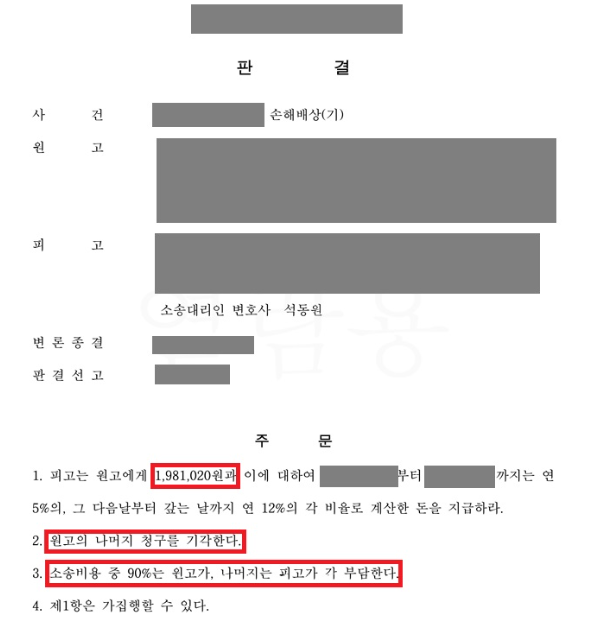 피고에게 인정된 인용금액은 1,981,210원인데, 이 금액은 원고 청구금액의 10%도 미치지 못하는 액수입니다. 또한 중요하게 보실 점은, 소송비용 중 90%를 원고가 부담하는 것으로 판결이 선고되었다는 점입니다. 여기서 소송비용이란 피고가 부담한 변호사비용을 포함하며, 결국 원고가 피고의 변호사비용을 거의 부담하게 된 것이라고 이해하시면 됩니다. 결과적으로 피고는 큰 경제적인 손실 없이 소송을 마무리할 수 있습니다.
