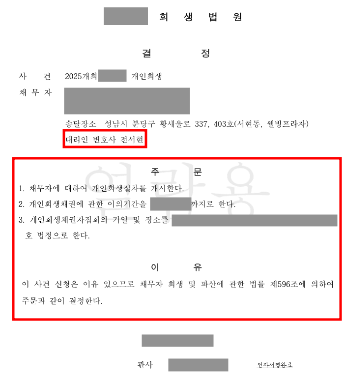 결국, 보이스피싱 범죄 피해로 인해 과도한 채무를 부담하게 되었다는 사실이 소명되었고, 빠른 시일 내 개인회생절차개시결정을 받을 수 있었습니다.